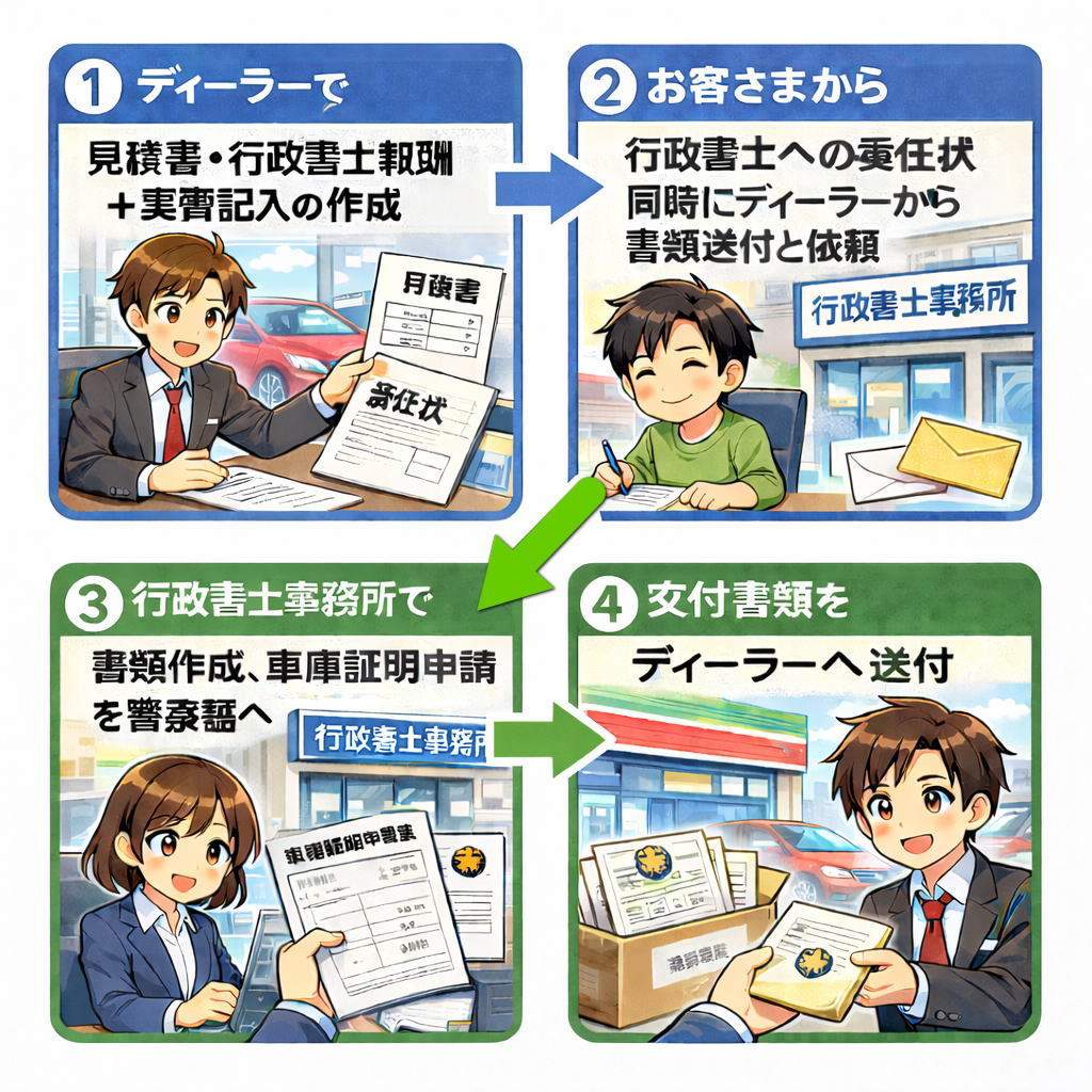 見積書に「登録代行料」「車庫証明代行料」を一式で入れて営業担当や事務スタッフが書類を作成し、警察署や陸運局に出しに行く